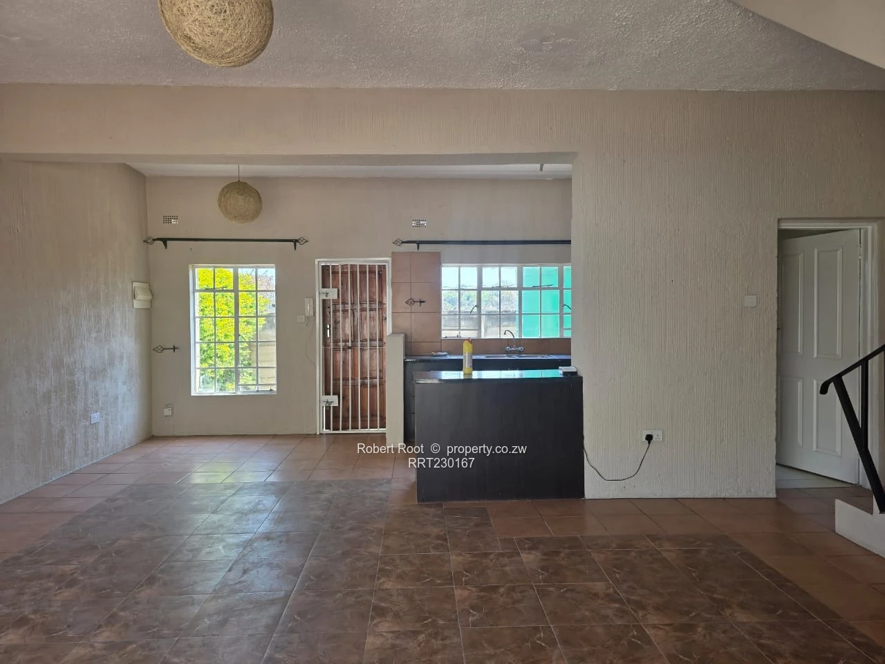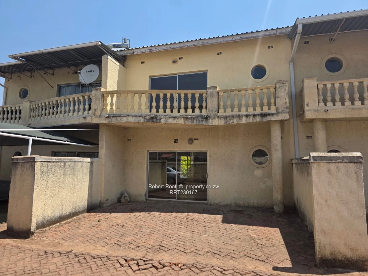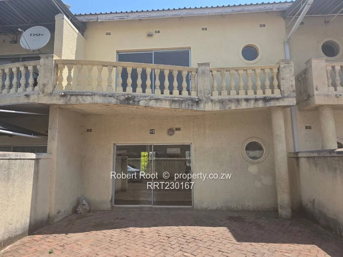 Discover this charming townhouse available to rent in the heart of Monavale, Harare. The exterior presents a classic two-story design, featuring a weathered stucco finish, decorative balustraded balconies, and eye-catching round windows that enhance its architectural appeal. The glass-framed entrance not only provides an inviting touch but also invites an abundance of natural light.