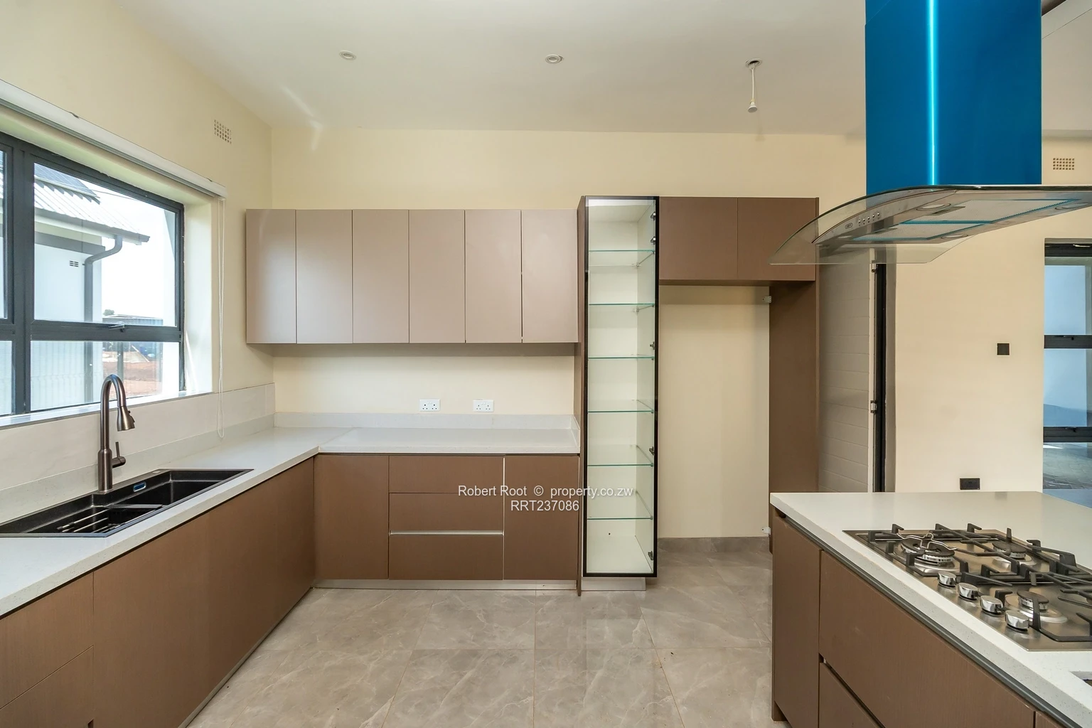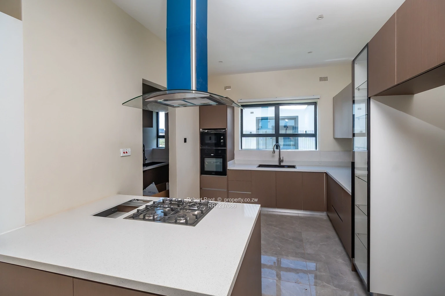 Step inside to an open-plan living area, providing a seamless connection between the lounge and dining room. The kitchen is a chef's dream, showcasing stylish cabinetry in rich brown tones, high-end built-in appliances, and an expansive countertop with a gas cooktop for your culinary pursuits.