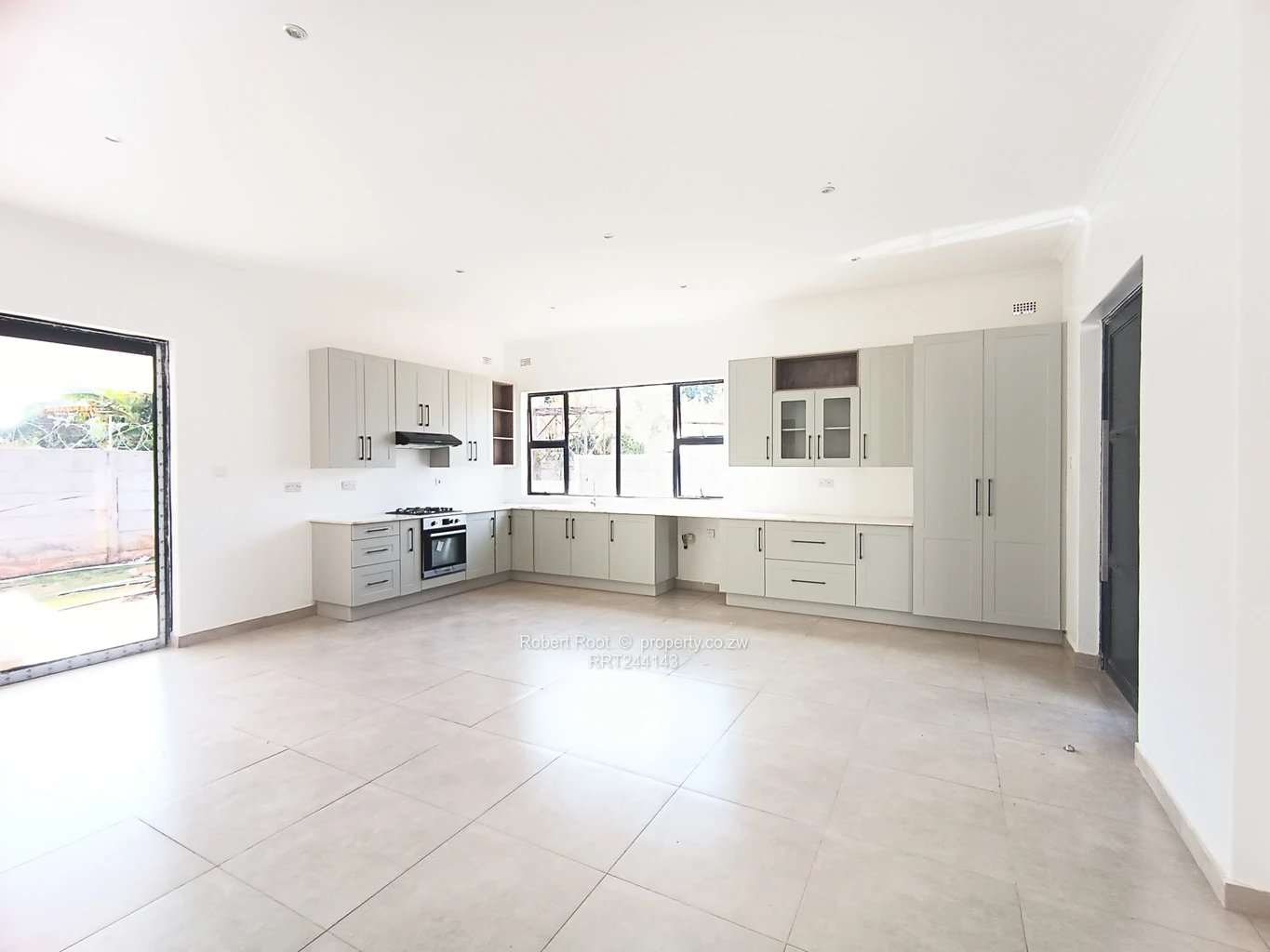 Step inside to discover an open-plan kitchen and living area bathed in natural light from large windows with white fitted cabinetry. There is ample storage space and kitchen workspace in this open plan living area. The large tiles underfoot add to the spacious and clean feel.