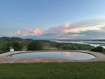 Perched on the heights of Chirundu, with breathtaking, unobstructed views of the Zambezi River, this charming brick under chromadek house on 3222sqm, includes 4 spacious bedrooms, 2 bathrooms (main ensuite). Open Living Space featuring a dining room and lounge that flows onto a semi-wraparound veranda that overlooks the swimming pool and river. Spacious Kitchen with fitted cupboards and a walk-in pantry. Versatile Mezzanine, this upper floor can serve as a 5th bedroom, a cozy 2nd lounge, or a productive office space—tailor it to your needs! There are ceiling fans throughout the living spaces to ensure a cool living environment.