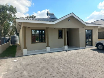 This charming house for sale in Arlington, Harare, boasts a modern design with a serene blue exterior and striking dark trim. The spacious porch welcomes you with tiled flooring and stylish columns, while large sliding glass doors enhance the natural light throughout the home.