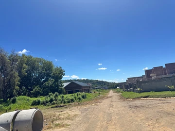 The front landscape is inviting, displaying lush grassy areas complemented by small hills, making it a picturesque setting. Construction materials such as bricks and wooden elements hint at the ongoing development, showcasing the potential of this versatile stand. With easy road access and water supply, this property is ideal for your next investment or home development.